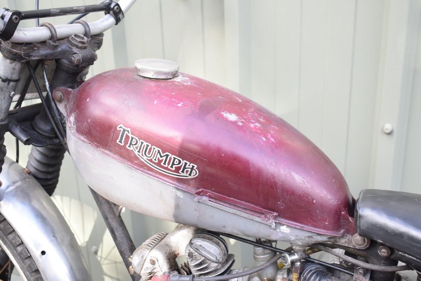 1959 Triumph Cub 200cc trials motorcycle, purchased by the vendor in 1970. With buff logbook, registration number 710 MPC though since then the frame was replaced after the original was bent and likewise the engine has been changed. The engine now has electronic ignition fitted and the bike comes with spares including engine cases, barrel and front fork legs