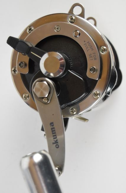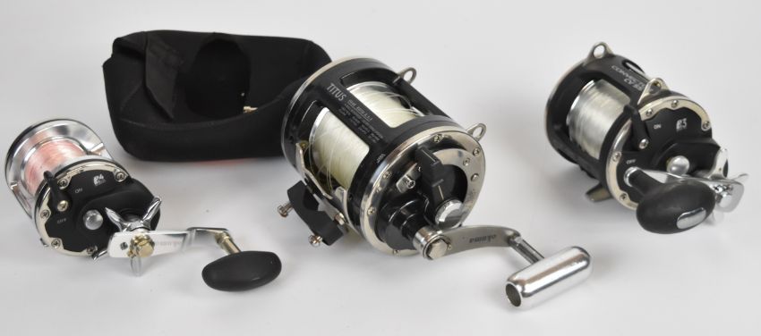 Three Okuma multiplier fishing reels including big game shark / tuna Titus T50L, Convector CV55L and a Catalina