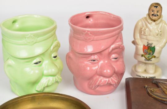 WW1 Bruce Bairnsfather interest ephemera including two jugs of 'Old Bill', two publications of 'Fragments from France', brass dish with 'Old Bill' to centre (diameter 14cm), W & R Carlton china figure of soldier 'Yours to a Cinder Bill' (H14cm) etc,  (8)
