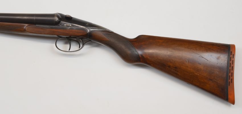 Darne 12 bore side by side shotgun with engraved sliding action, chequered grip and forend, double trigger and 27.5 inch barrels choked ½ and full, overall length 111cm, length of pull 37.5cm, serial number TT293. PLEASE NOTE THAT A VALID RELEVANT FIREARMS/SHOTGUN CERTIFICATE IS REQUIRED TO HANDLE/PURCHASE THIS ITEM.