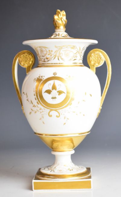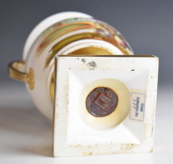 Swansea porcelain 19thC twin handled pedestal pot pourri with two covers, decorated with a garden water feature and flowers including auriculas, H24cm
