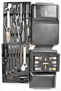 Two classic Rolls Royce car tool and bulb sets, including King Dick and Gedore adjustable and Gedore and Bedford combination spanners, Steadfast and Stanley driver handles and Dunlop tyre pressure gauges, one with Rolls Royce and Bentley logo to lid, length 27cm