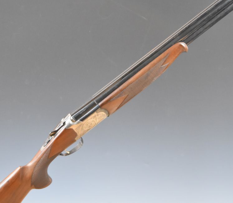 Lanber 12 bore over and under ejector shotgun with engraved locks, underside, trigger guard, top plate and thumb lever, chequered semi-pistol grip and forend, single trigger, vented top and central ribs and 29.5 inch multi-choke barrels, overall length 118cm, length of pull 36cm, serial number 313909. PLEASE NOTE THAT A VALID RELEVANT FIREARMS/SHOTGUN CERTIFICATE IS REQUIRED TO HANDLE/PURCHASE THIS ITEM.