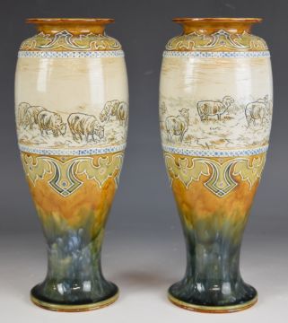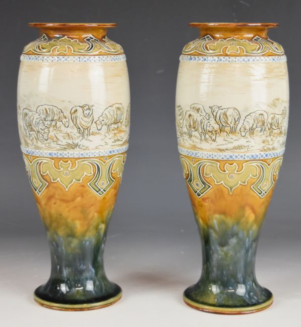Hannah Barlow for Royal Doulton pair of art pottery pedestal vases sgraffito decorated with sheep, signed with monogram to bases, H28cm
