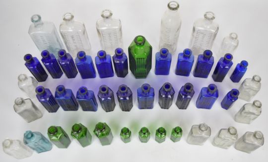 Fifty-two clear and coloured glass medicine and poison bottles of various shapes, some marked 'Not To Be Taken', 'Tea Spoons' and 'Table Spoons', largest 20cm tall.