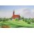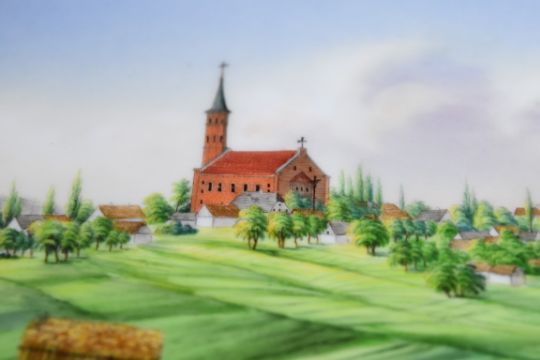 19th/20thC oval continental porcelain plaque decorated with a pastoral scene of a horse drawn carriage with corn stocks, church and figures, indistinct impressed marks verso possibly a cross in circle, 14.5 x 18.5cm