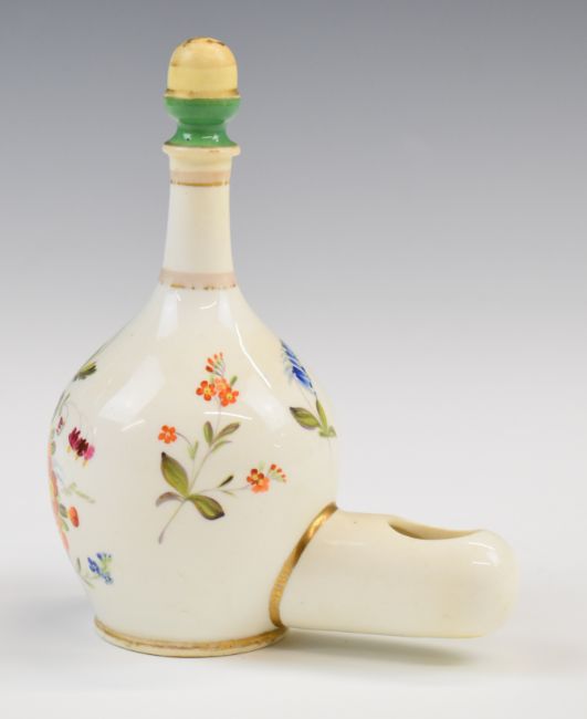 Coalport 19thC porcelain bird feeder with floral decoration and fixed knopped top for suspension purposes, H15cm
