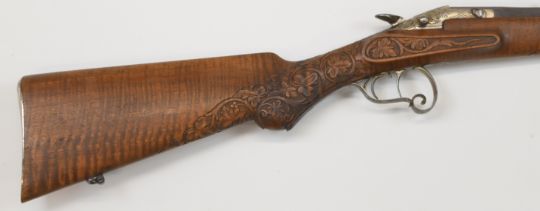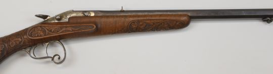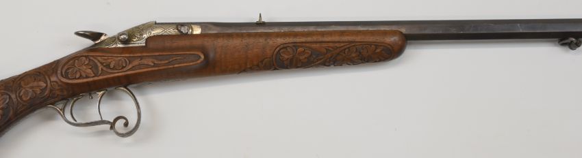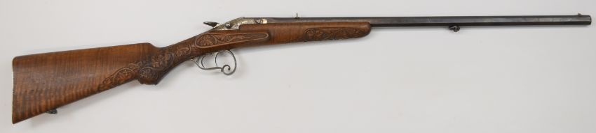 Decativated Belgian Flobert pattern .22 Short rook rifle with mask and scroll engraved action and scrolling trigger guard, carved semi-pistol grip and forend, raised cheek piece, sling suspension mounts, fixed sights, set trigger and engraved 23.5 inch octagonal barrel, overall length 99cm, 5783, with de-activation certificate dated 25/05/2024.