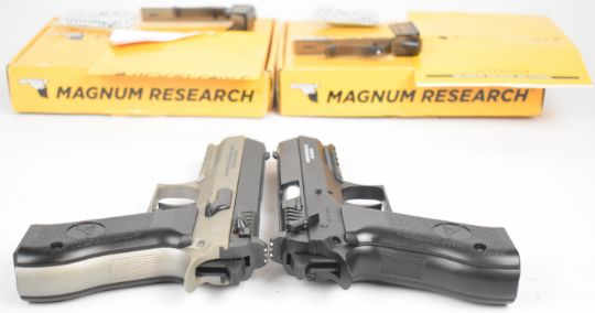 Two Magnum Research Baby Desert Eagle .177 CO2 air pistols, each with monogrammed and textured grips and fixed sights, both in original boxes with instructions and accessories.