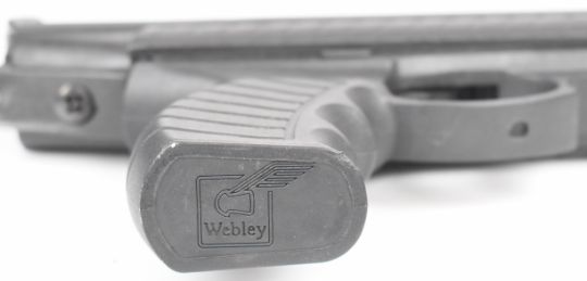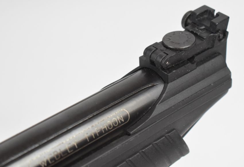 Webley Typhoon .177 target air pistol with shaped composite grip and, barrel shroud and adjustable sights, serial number 110908568, in original box with related paperwork.