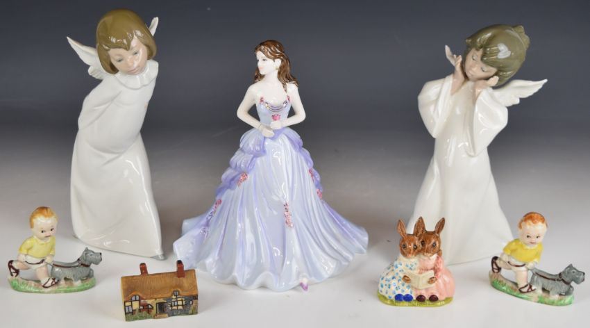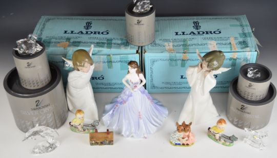 Lladro, Coalport, Wade and Swarovski figures, some boxed, tallest 22cm