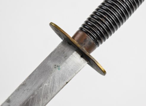 Fairbairn Sykes style fighting knife with ribbed grip, 17.5cm double edged blade and leather sheath. PLEASE NOTE:- Before bidding please ensure that you are fully aware of any law regarding ownership and of any limitations on shipping of this item