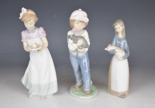 Ten Lladro / Nao bird and child figures including Let's Make Up, Happy Birthday, Girl with Pig / Lamb, Girl with Chamberstick etc, all boxed, tallest 26cm
