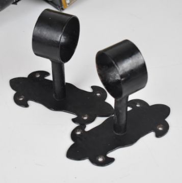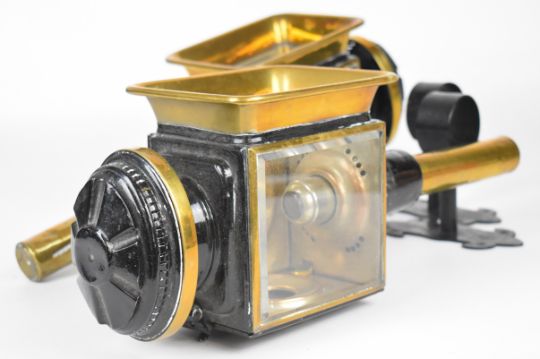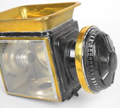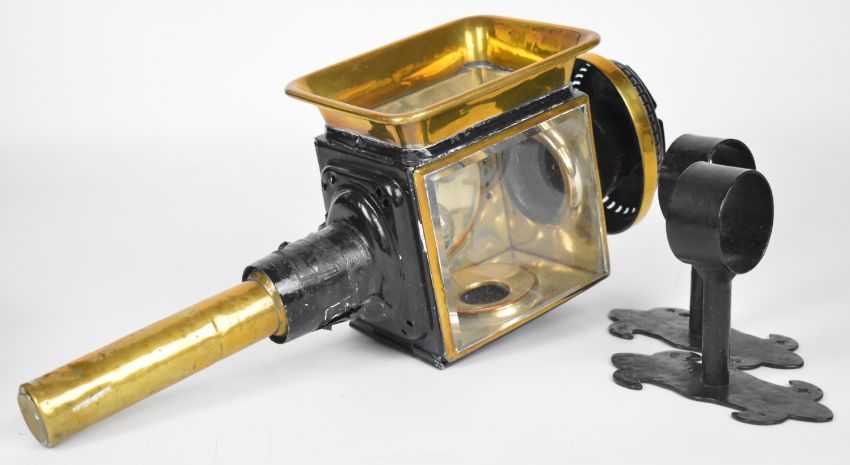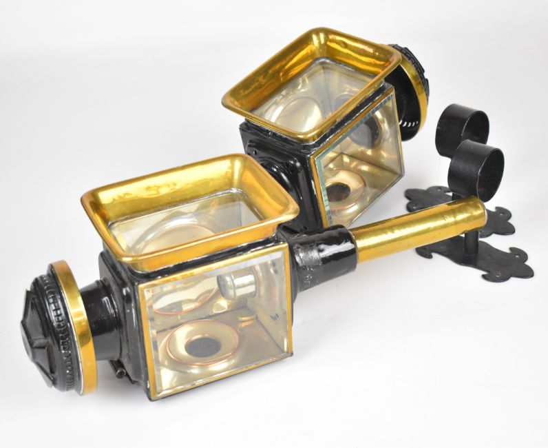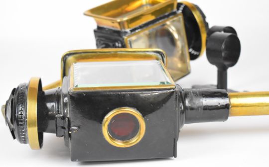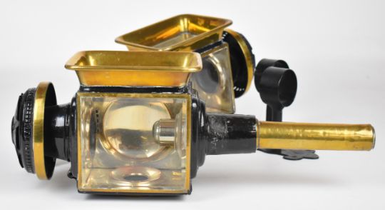 Pair of 19th or early 20th century carriage or coaching lamps with spring loaded candle holders, bevelled glass and brass rims, height 43cm