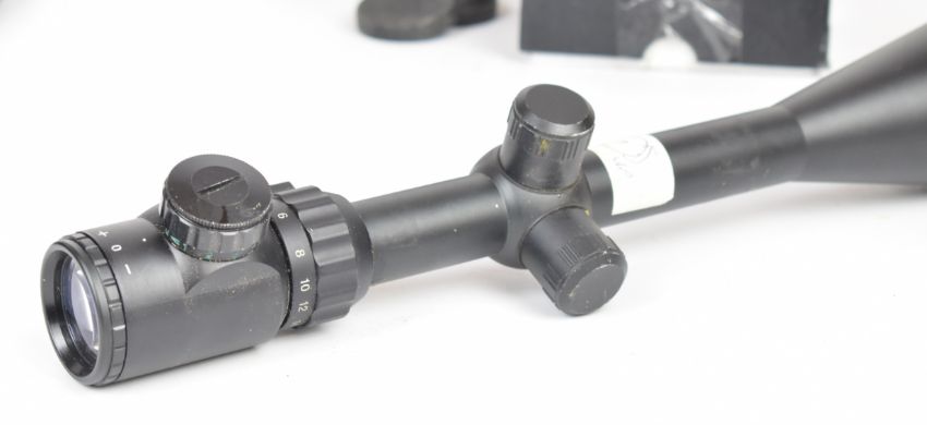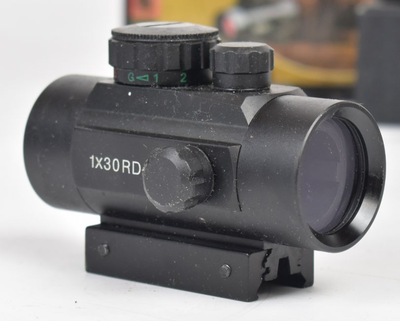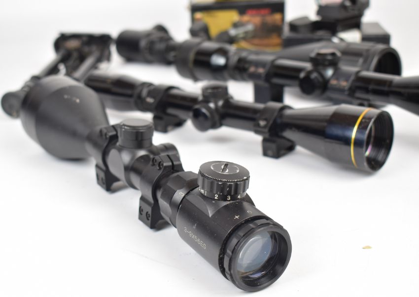 A collection of rifle scopes and accessories comprising two red dot sights, Nikko Stirling Silver Crown 4x40, Tasco 4x40, 6-24x50 and 3-9x56 scopes and a bi-pod.