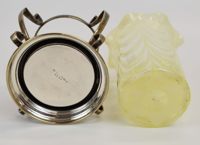 Art Nouveau silver plated and vaseline glass celery vase, 19cm tall.