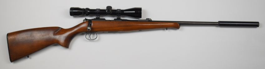 CZ 452-2E ZKM .22 bolt-action rifle with semi-pistol grip, sling mounts, scope, sound moderator and 24 inch barrel, overall length 107cm, serial number 604175. PLEASE NOTE THAT A VALID RELEVANT FIREARMS/SHOTGUN CERTIFICATE IS REQUIRED TO HANDLE/PURCHASE THIS ITEM.