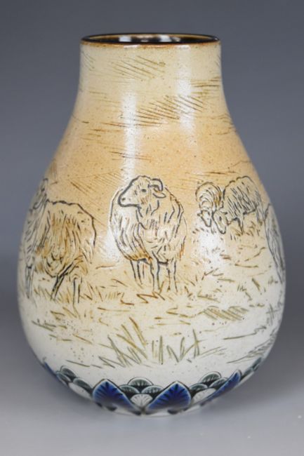 Hannah Barlow for Doulton Lambeth art pottery squat vase sgraffito decorated with sheep, signed with monogram to base, H14cm