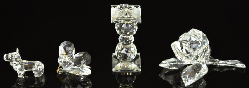 Thirteen Swarovski animals and ornaments including cats, dogs, swans, butterflies etc.