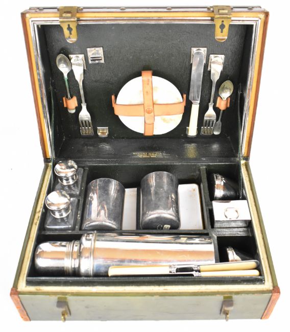 Drew & Sons Piccadilly Edwardian or veteran motoring picnic set housed in a sloping footrest, marked to rear of green leather interior registered No 541104/5 English patent No. 18693/1909, housing Majic drinks flask, two silver plated tumblers, plate, cutlery inside the lid and two enamel rectangular dishes, the case having leather corner protectors and brass fittings, of vintage car interest, width 37cm
