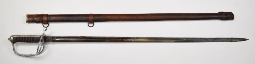 British Army 1821 pattern Royal Artillery officer's sword with fish skin and wire bound grip, Edward VIII cypher to 85cm decorated blade and a leather covered scabbard. PLEASE NOTE:- Before bidding please ensure that you are fully aware of any law regarding ownership and of any limitations on shipping of this item