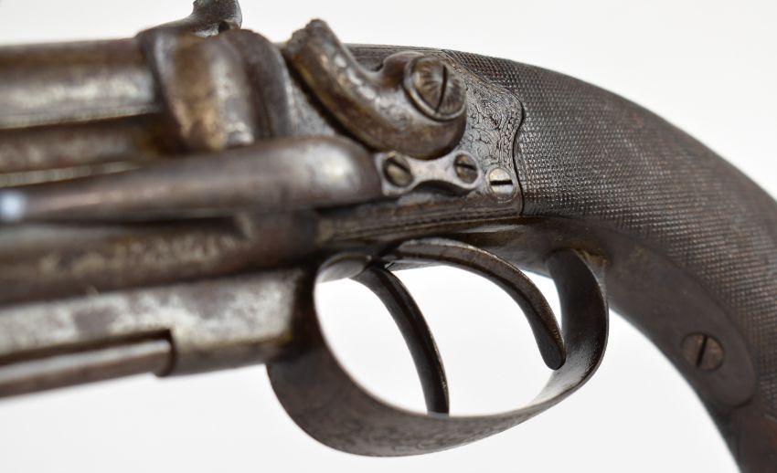 William Moore of London double barrelled over and under percussion hammer action pistol with scrolling engraving to the lock, hammers, trigger guard, top strap and butt plate, vacant wrist cartouche, storage compartment to the butt, captive ram-rod and named 3 inch smooth bored barrels, overall length 21cm.
