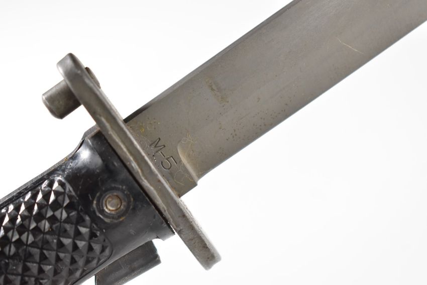 American M5 A1 Garand knife bayonet with M5 to ricasso, 17cm single edged blade and scabbard marked U.S M8A1.V.P.Co, with belt loop. PLEASE NOTE:- Before bidding please ensure that you are fully aware of any law regarding ownership and of any limitations on shipping of this item