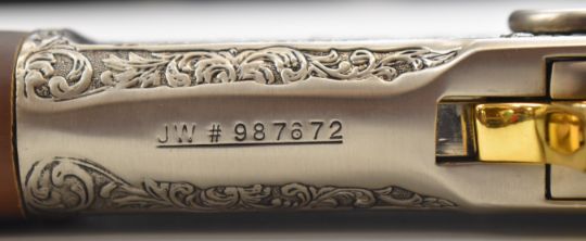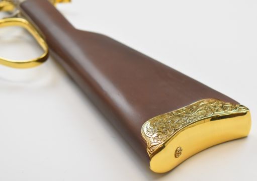 Franklin Mint The John Wayne 1892 Model .44-40 rifle with ornate decoration to the locks, gold plated underlever, butt plate and hammer and plaque inset to the stock, on wall frame, 37x109cm.
