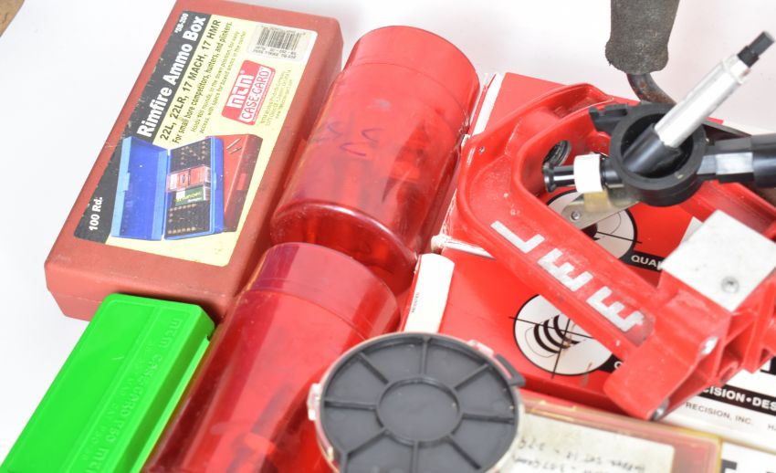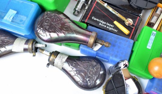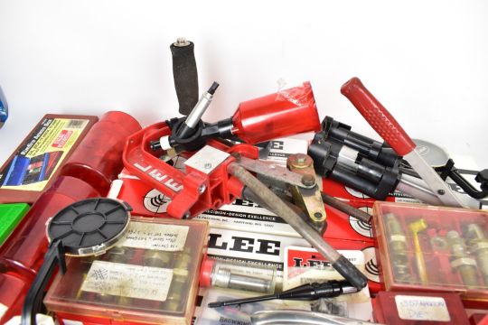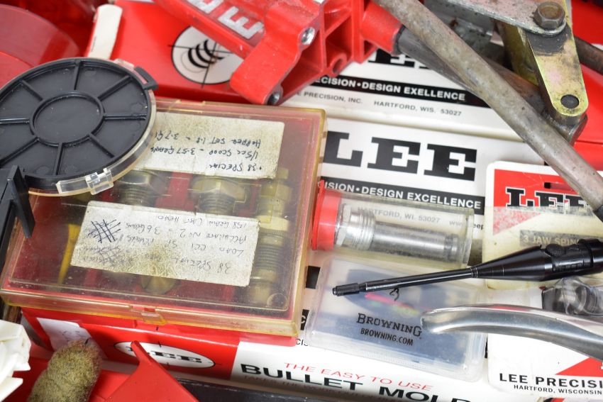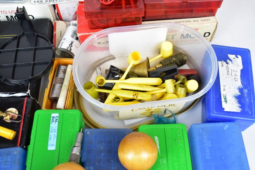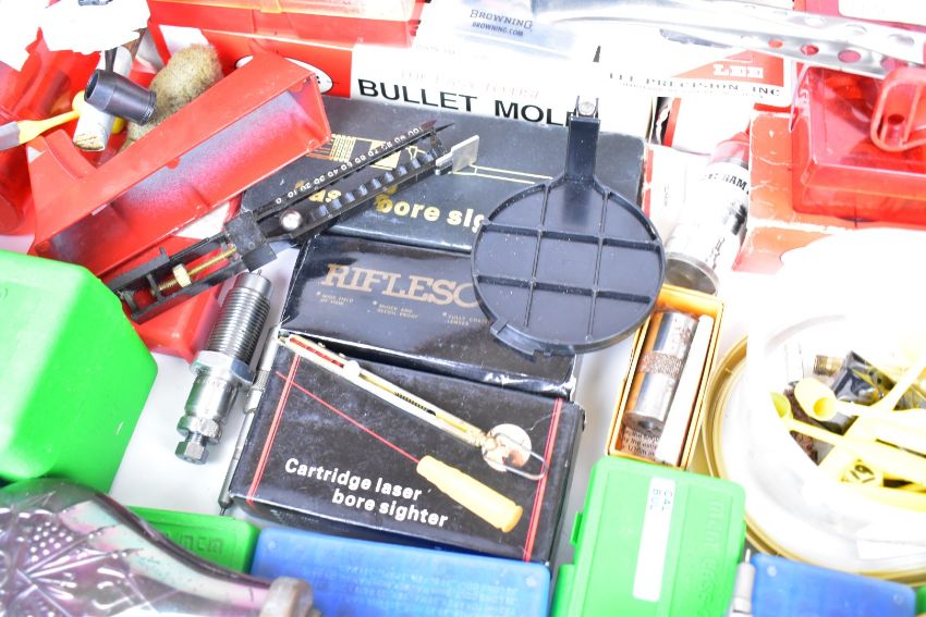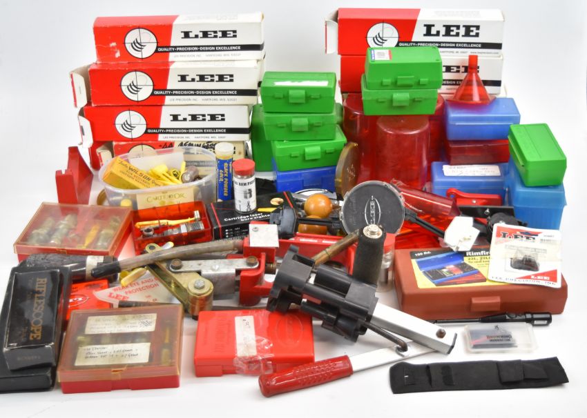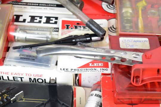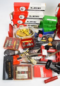 A collection of shotgun and rifle cartridge re-loading equipment for .38 Special, .44 Remington, .45, .36, .357 etc including Lee bullet moulds/dies, cartridge laser bore sighter, Lee press, powder scales, brass percussion cap dispenser, powder flasks etc, some in original boxes/ packaging.