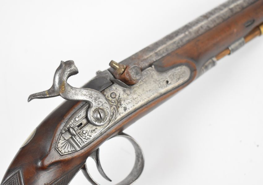 William Smith of Princes St Leicester Square London 36 bore percussion hammer action coat pistol with named and engraved lock, engraved trigger guard and top plate, sliding safety, vacant wrist cartouche, chequered grip, brass tipped wooden ram-rod and 5 inch smooth bored barrel, overall length 25.5cm.