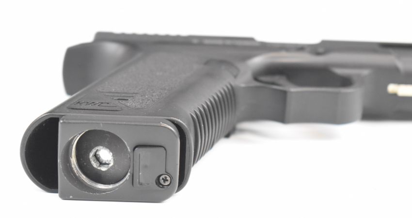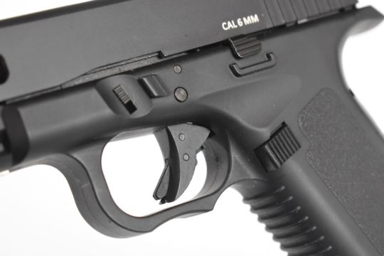 KWC 6mm COairsoft pistol with textured grips, multi-shot magazine and fixed sights, serial number 17919911, in original box with instructions and accessories.