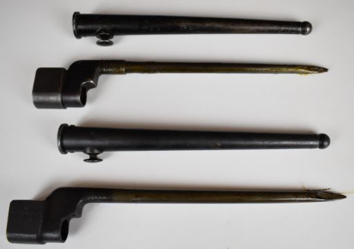 Two British No4 MKII spike bayonets, blade length 20cm, both with scabbards. PLEASE NOTE:- Before bidding please ensure that you are fully aware of any law regarding ownership and of any limitations on shipping of this item