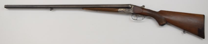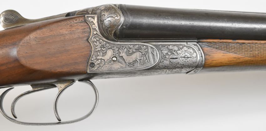 Bohler of Austria 16 bore side by side shotgun with engraved scenes of birds, dogs, deer and rabbits to the locks, underside and trigger guard and foliage to the fences and thumb lever, chequered semi-pistol grip and forend, horn butt plate, sling mounts, double trigger and named 27.5 inch barrels, overall length 111cm, length of pull 36cm, serial number 194593920. PLEASE NOTE THAT A VALID RELEVANT FIREARMS/SHOTGUN CERTIFICATE IS REQUIRED TO HANDLE/PURCHASE THIS ITEM.
