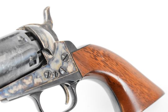 Henry Krank Pudsey .36 six shot single action percussion revolver with engraved scenes of ships to the cylinder, wooden grips and 8 inch barrel, overall length 37cm, serial number P63613. PLEASE NOTE THAT A VALID RELEVANT FIREARMS/SHOTGUN CERTIFICATE IS REQUIRED TO HANDLE/PURCHASE THIS ITEM.