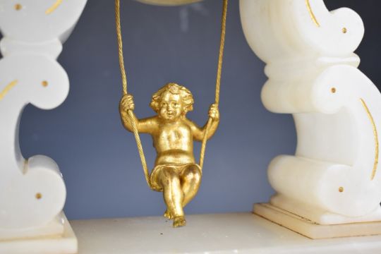 Farcot or similar French novelty mystery clock with swinging cherub pendulum and part skeletonised front plate and white marble or alabaster case, height 34cm, under a glass dome