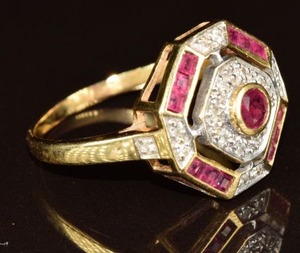 An 18ct gold Art Deco style ring set with rubies and diamonds, 5g, size R