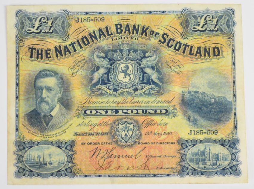 National Bank of Scotland 1916 £1 banknote with one hand signed and one printed signature