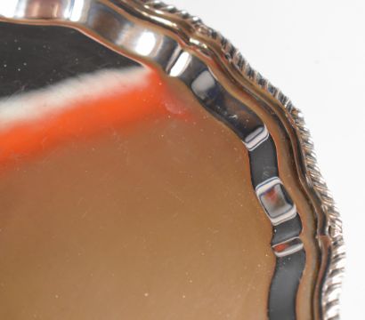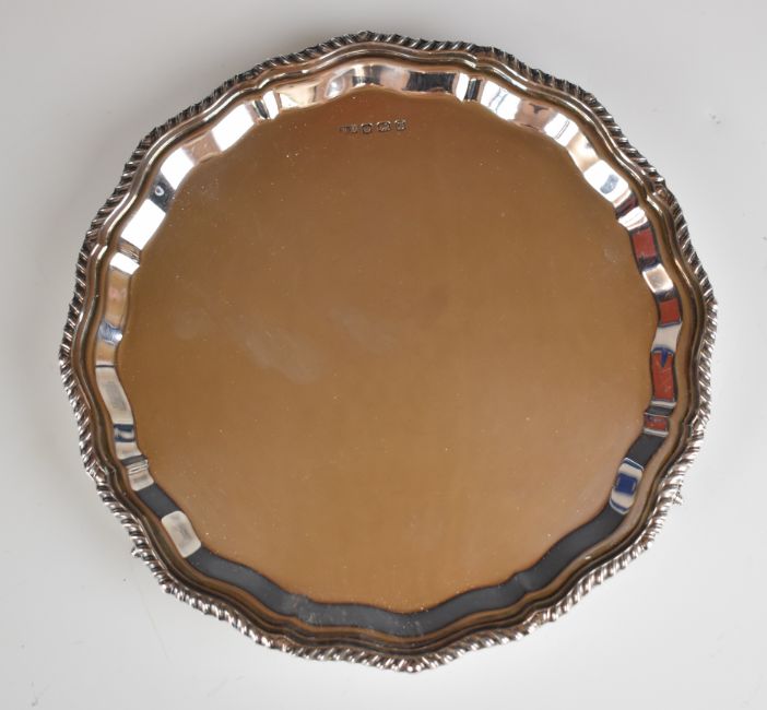 Elizabeth II hallmarked silver salver with shaped and gadrooned edge, raised on three ball and claw feet, Sheffield 1973, maker's mark BD, diameter 21cm, weight 322g