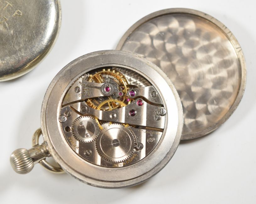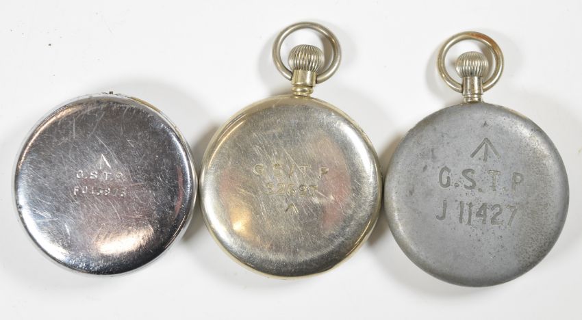 Three military keyless winding open faced pocket watches Jaeger LeCoultre, Grana and Damas, each with subsidiary seconds dial, luminous hands, Arabic numerals, white dial and GSTP military markings to the case back, largest case diameter 51mm.