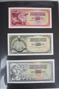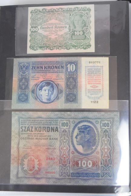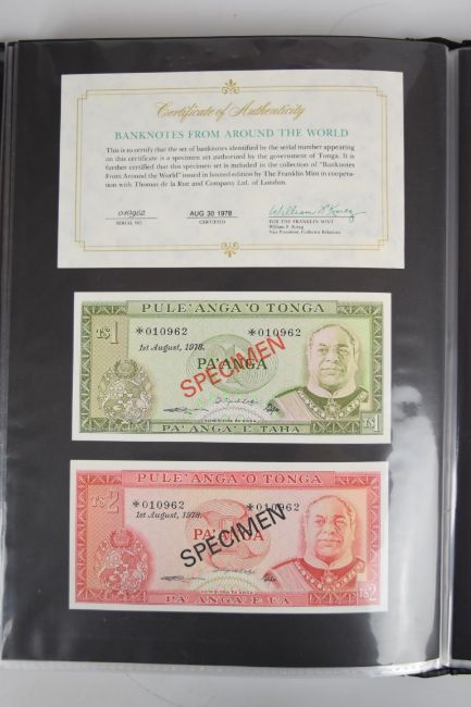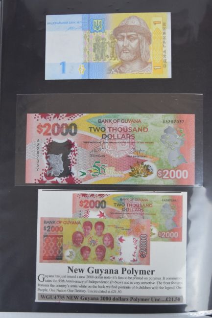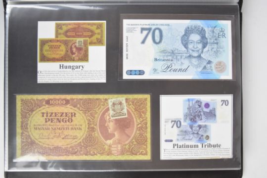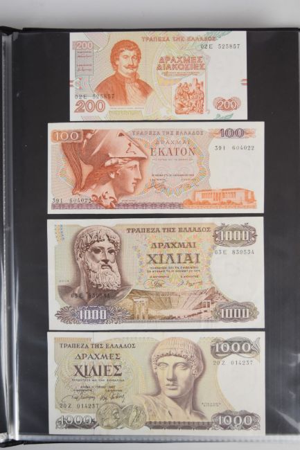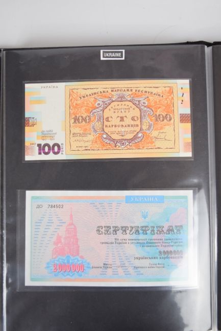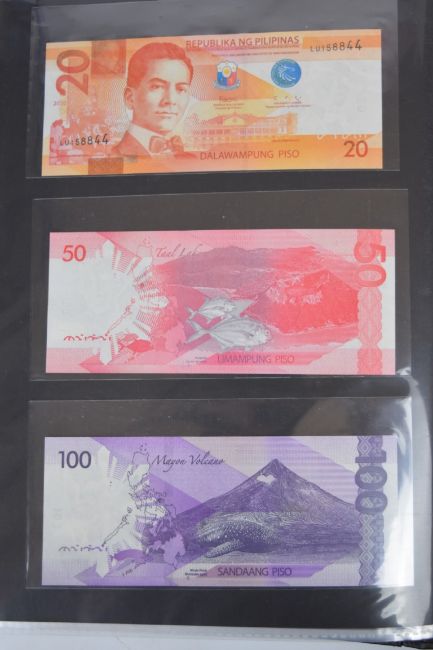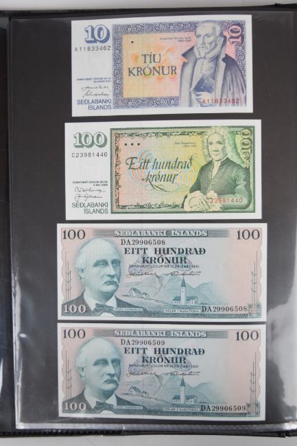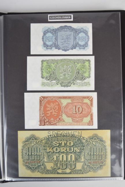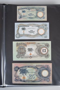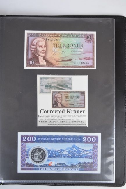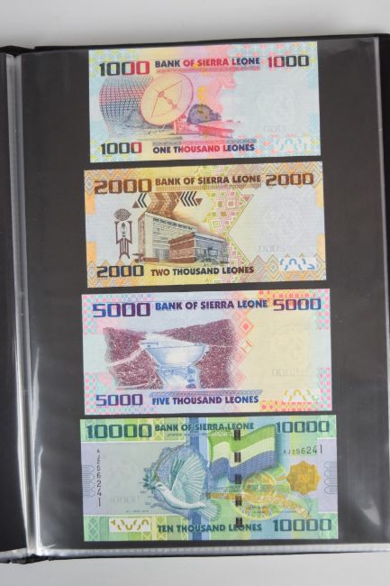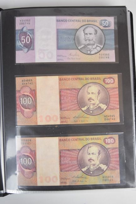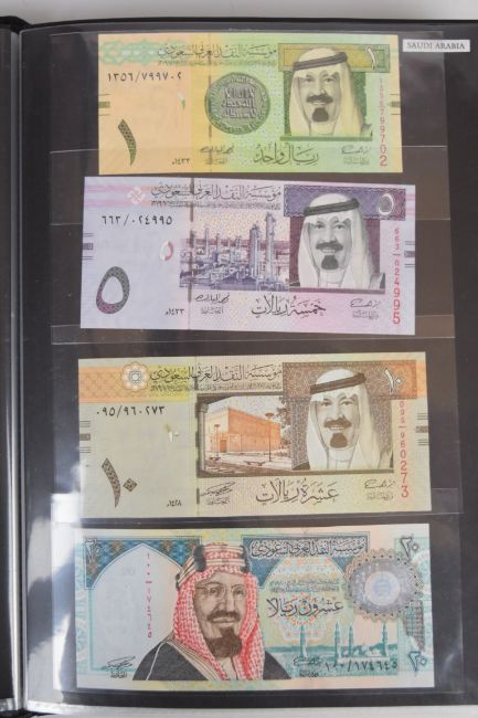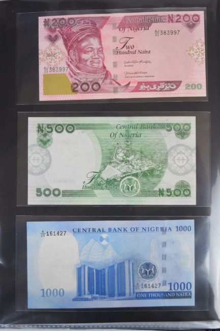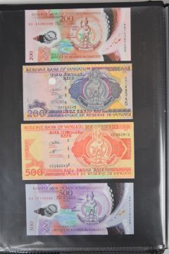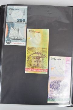 Collection of approximately 200 world banknotes in an album, including Vanuatu, Poland, Krygystan, Switzerland, Iceland, Saudi Arabia, Brazil, Portugal, Denmark, Yugoslavia, Kenya, Timor, Biafra, Sierra Leone, Liechtenstein and others. Some notes are individually encased in plastic wallets, other have been attached directly to thin card with small amounts of weakly adhesive tape
