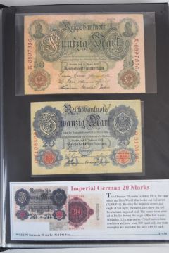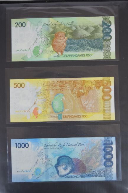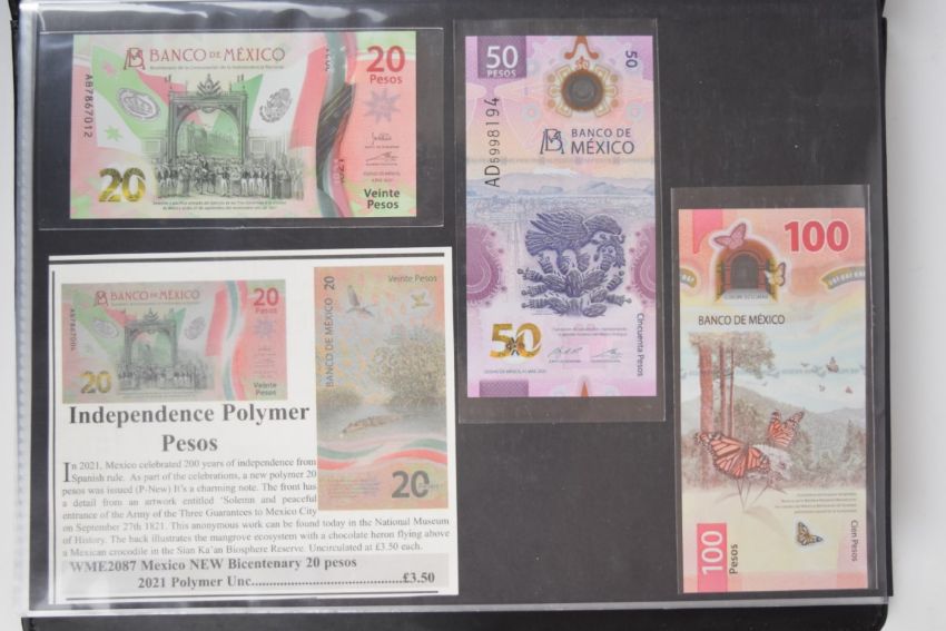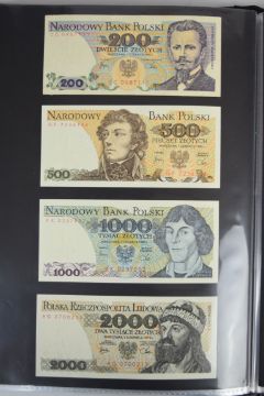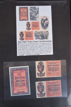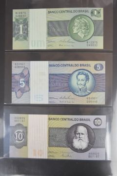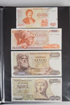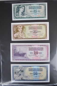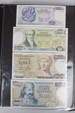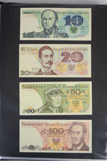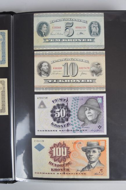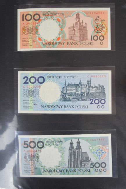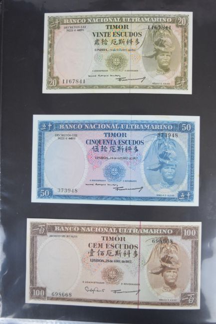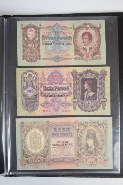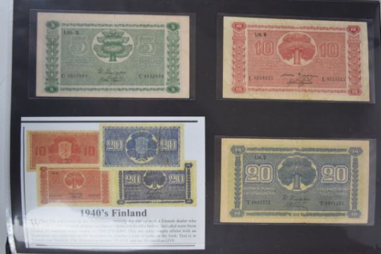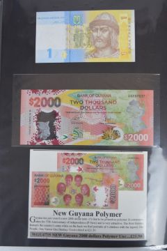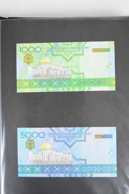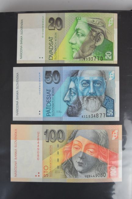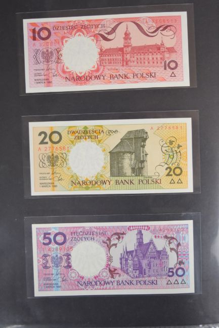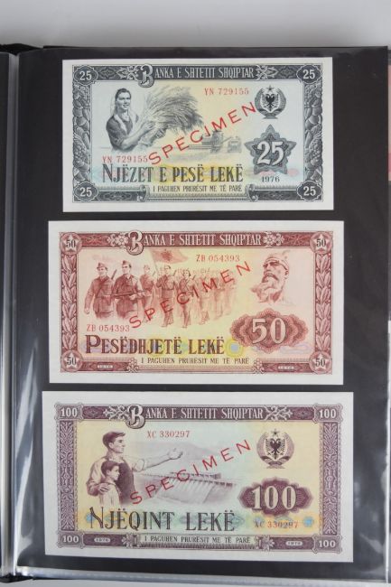 Collection of approximately 200 world banknotes in an album, including Vanuatu, Poland, Krygystan, Switzerland, Iceland, Saudi Arabia, Brazil, Portugal, Denmark, Yugoslavia, Kenya, Timor, Biafra, Sierra Leone, Liechtenstein and others. Some notes are individually encased in plastic wallets, other have been attached directly to thin card with small amounts of weakly adhesive tape