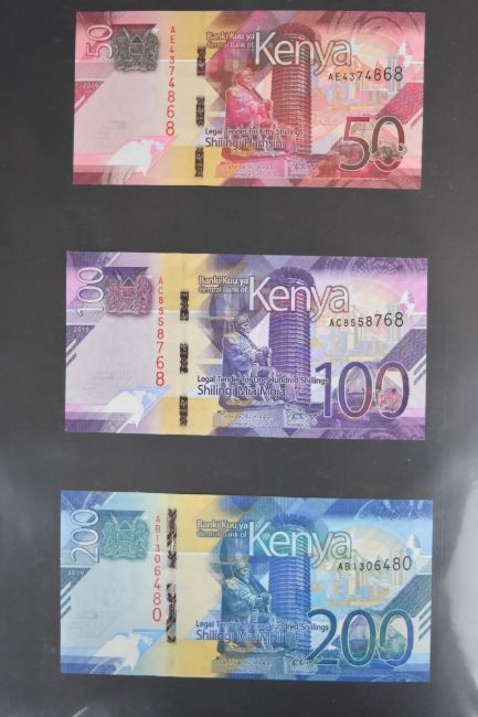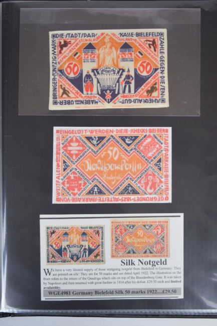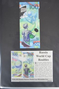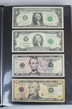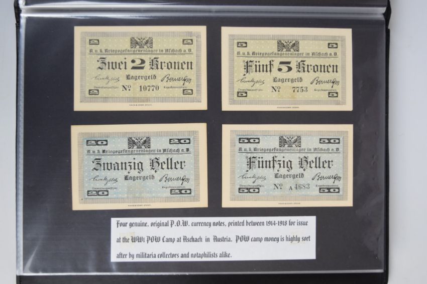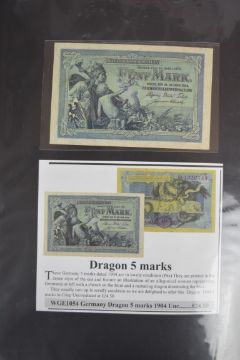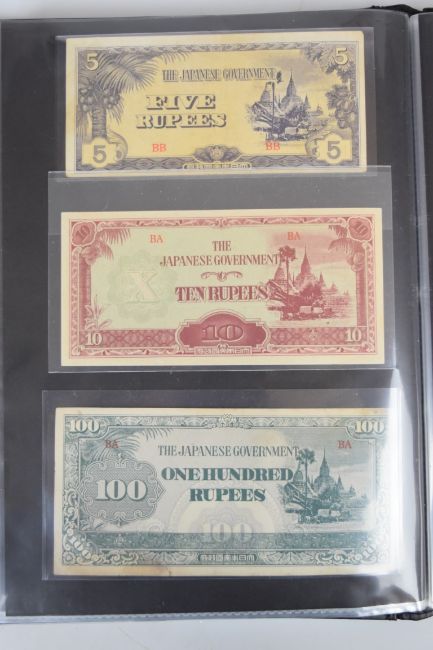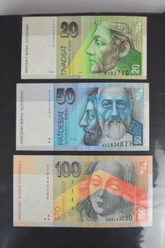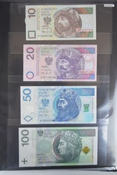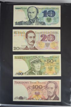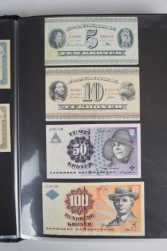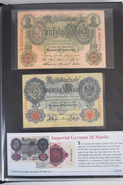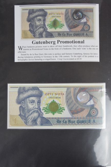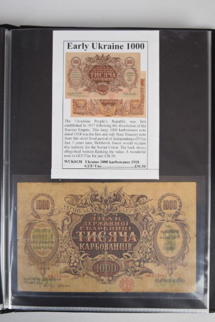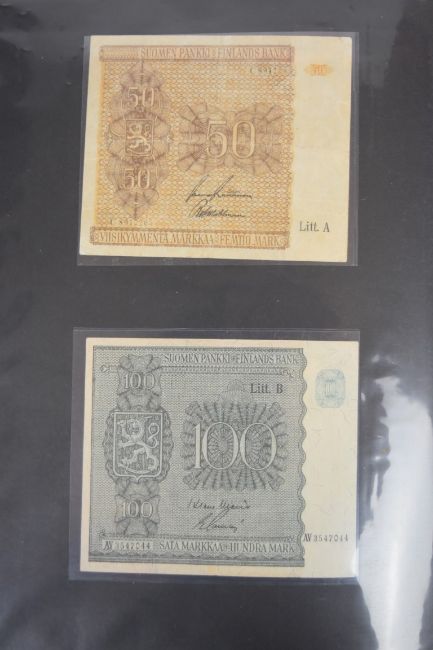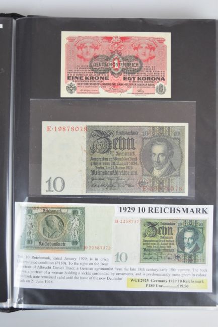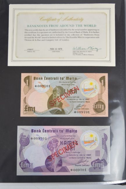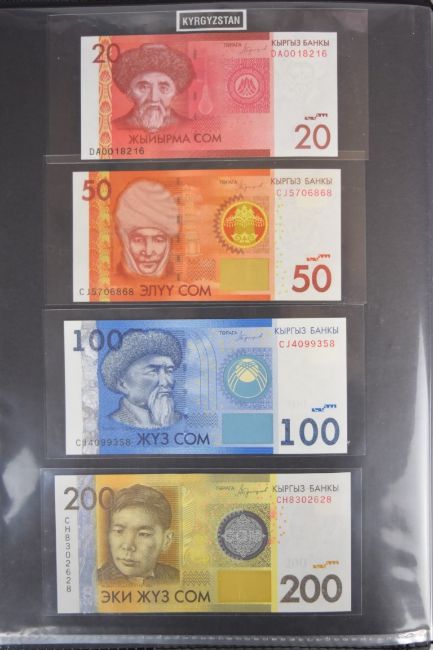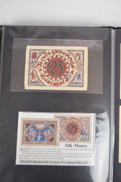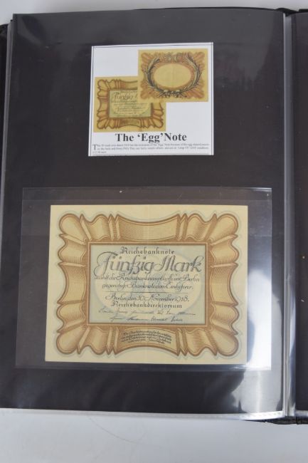 Collection of approximately 200 world banknotes in an album, including Vanuatu, Poland, Krygystan, Switzerland, Iceland, Saudi Arabia, Brazil, Portugal, Denmark, Yugoslavia, Kenya, Timor, Biafra, Sierra Leone, Liechtenstein and others. Some notes are individually encased in plastic wallets, other have been attached directly to thin card with small amounts of weakly adhesive tape