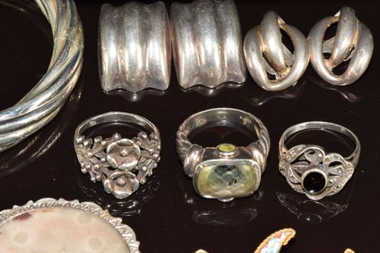 A collection of silver jewellery including bangle, fob, St Christopher, Victorian locket, brooch, two pairs of earrings, three rings, locket and a micro mosaic brooch (silver 105g)
