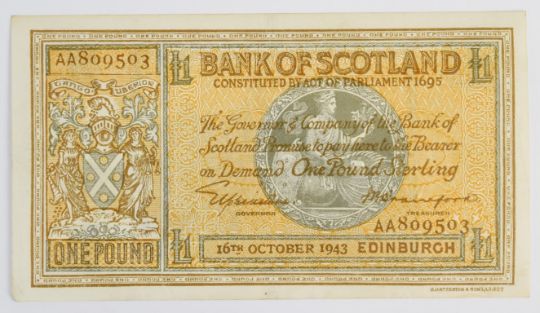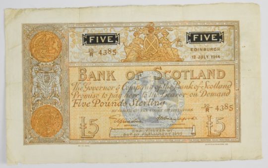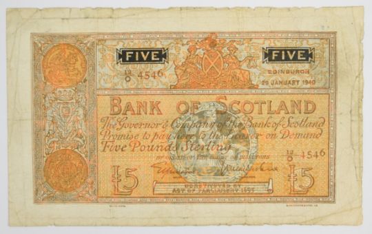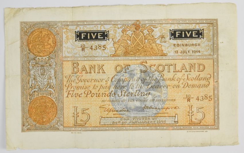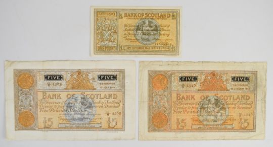 Three Bank of Scotland WW2 banknotes including £5 dated 1940 and 1944