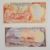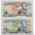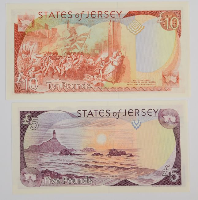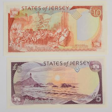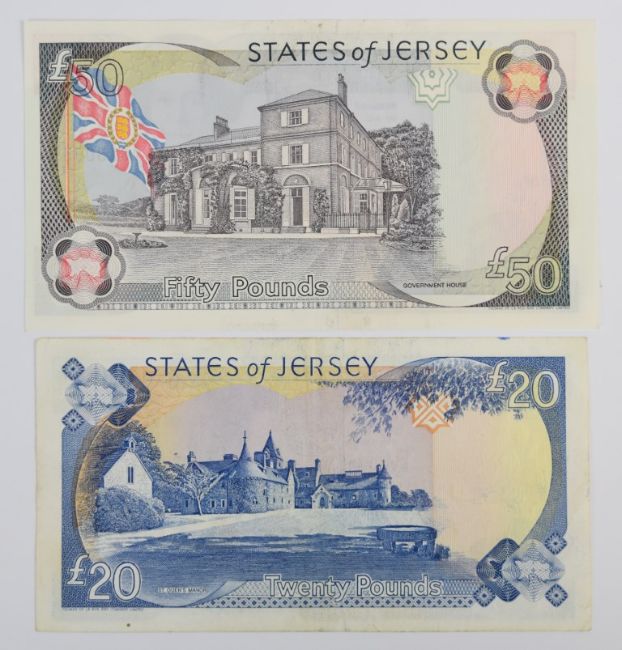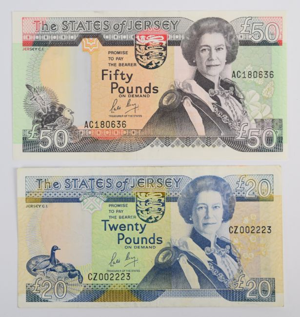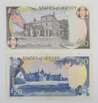 Four Jersey 1989 issue banknotes including £5, £10, £20 and £50, all signed by Leslie May. The £20 note has the serial prefix 'CZ' indicating that it is a replacement note, and the £10 note has serial number AC000484