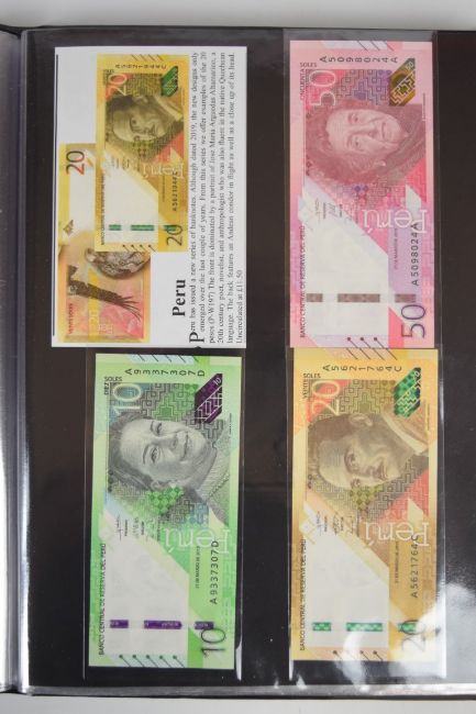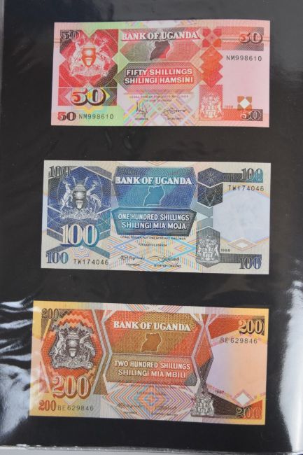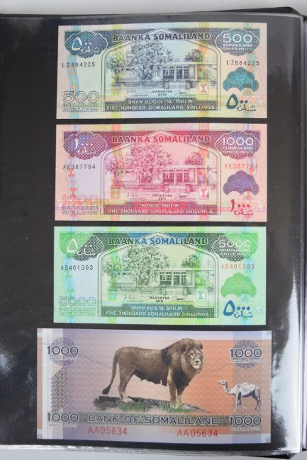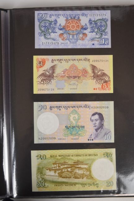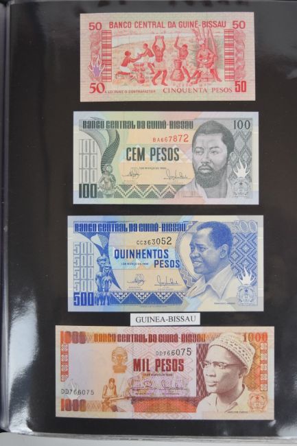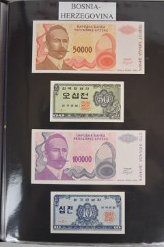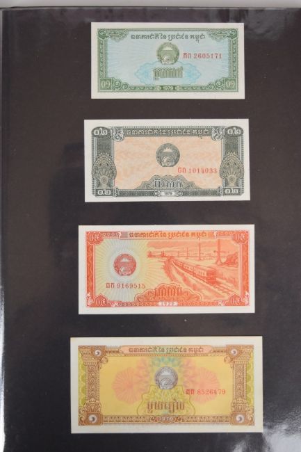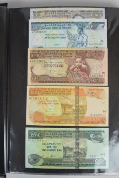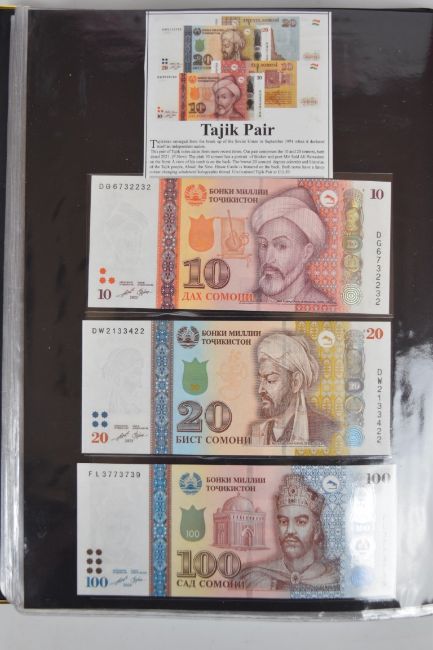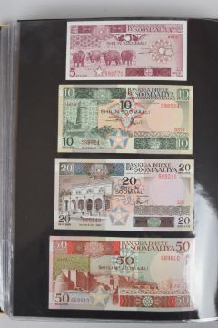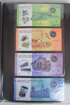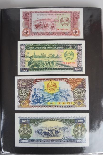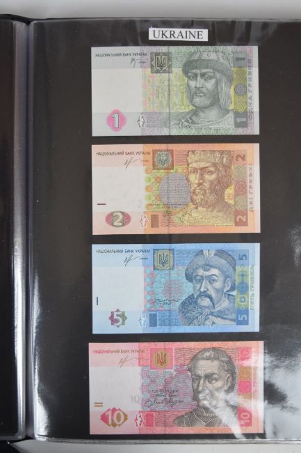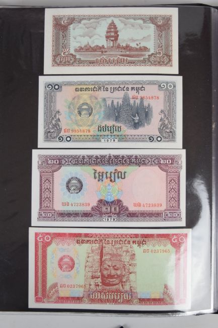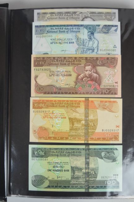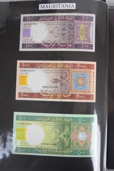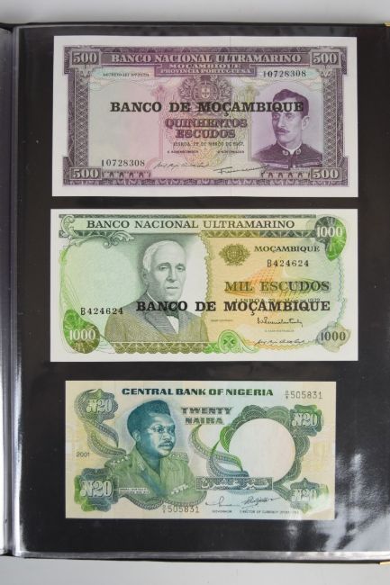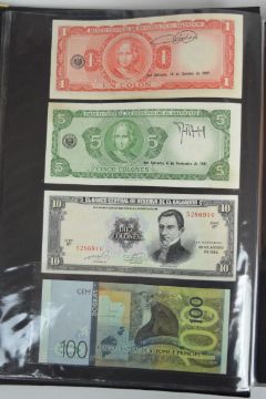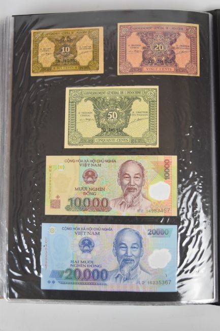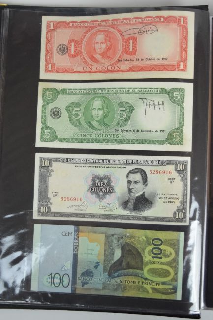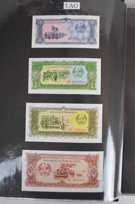 Collection of approximately 240 world banknotes in an album, including Ethiopia, El Salvador, Haiti, Suriname, Burundi, Laos, Nicaragua, Kazakhstan, The Maldives, Moldova, Guatemala, Hong Kong, Ukraine, Bangladesh and others. Some notes are individually encased in plastic wallets, others have been attached directly to thin card with small amounts of weakly adhesive tape