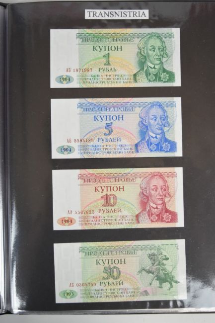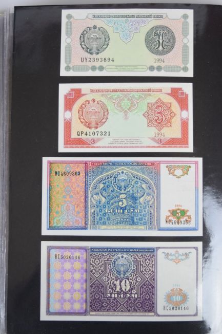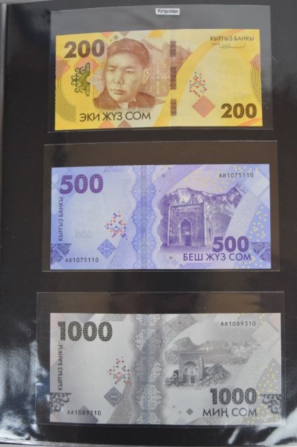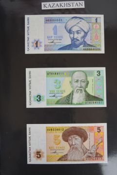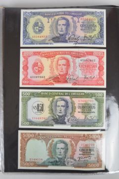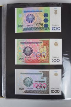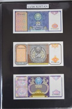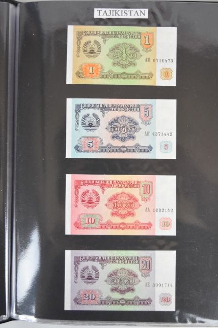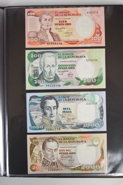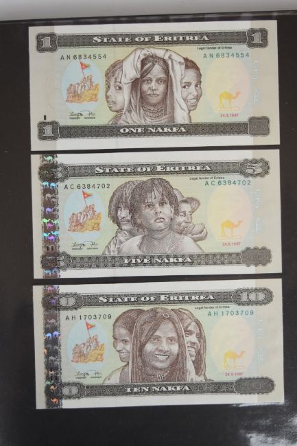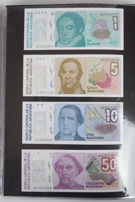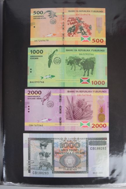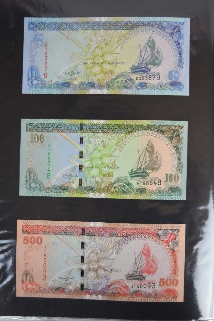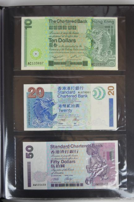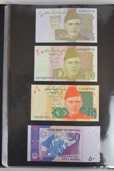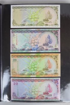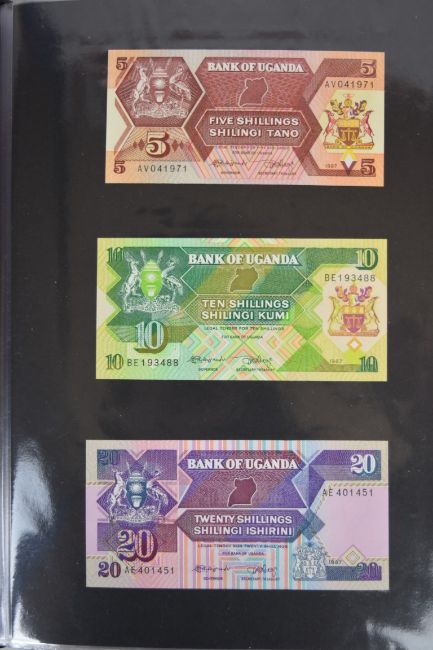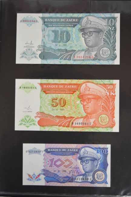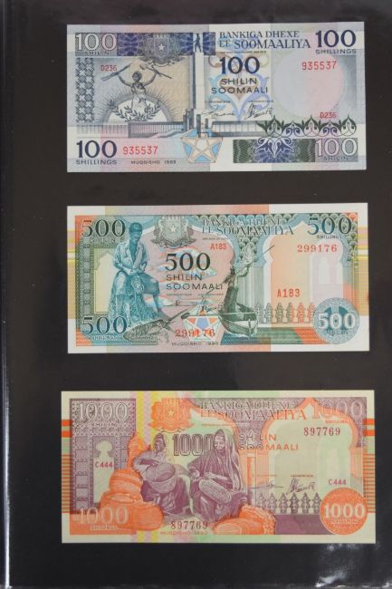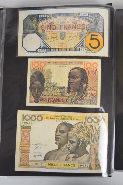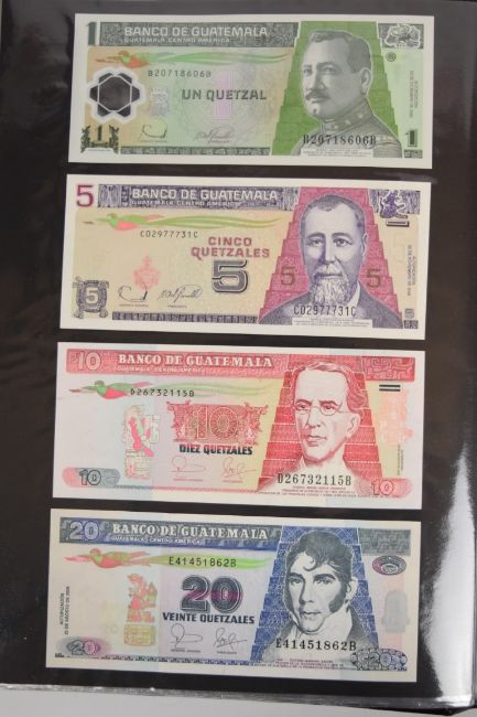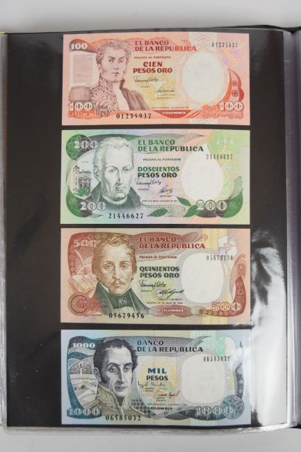 Collection of approximately 240 world banknotes in an album, including Ethiopia, El Salvador, Haiti, Suriname, Burundi, Laos, Nicaragua, Kazakhstan, The Maldives, Moldova, Guatemala, Hong Kong, Ukraine, Bangladesh and others. Some notes are individually encased in plastic wallets, others have been attached directly to thin card with small amounts of weakly adhesive tape