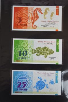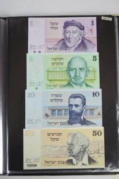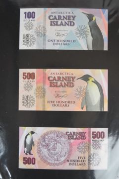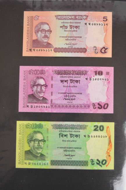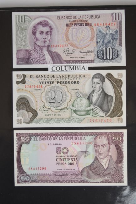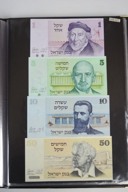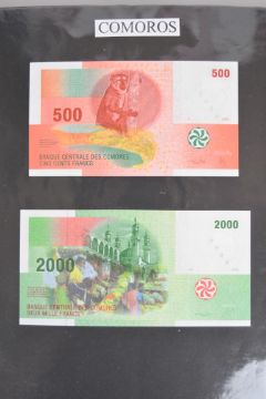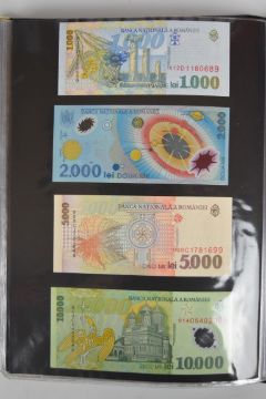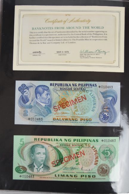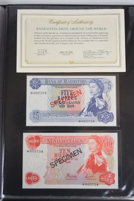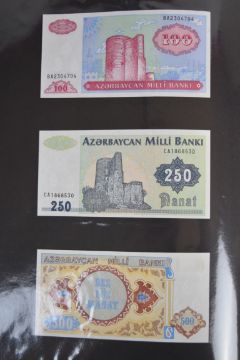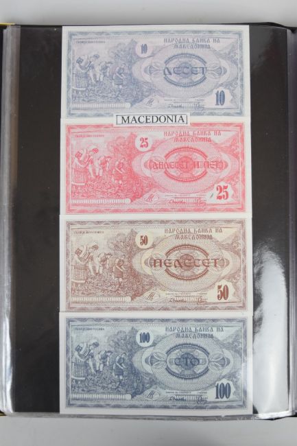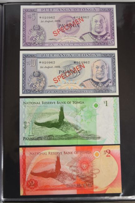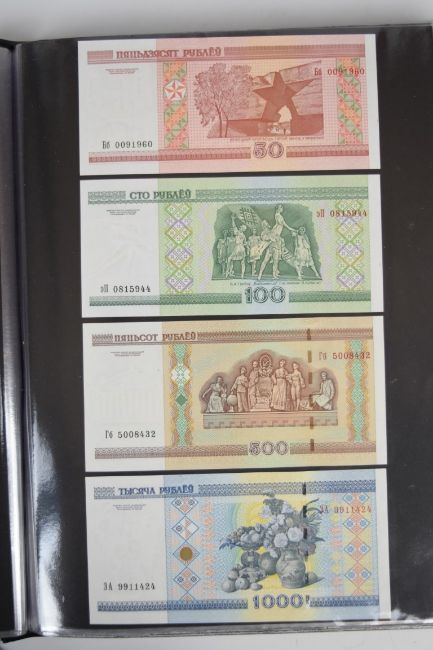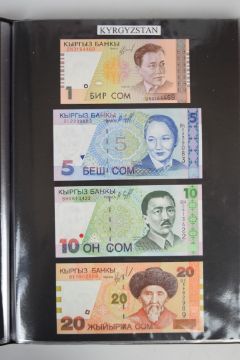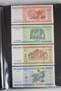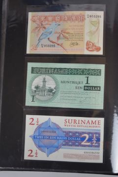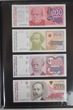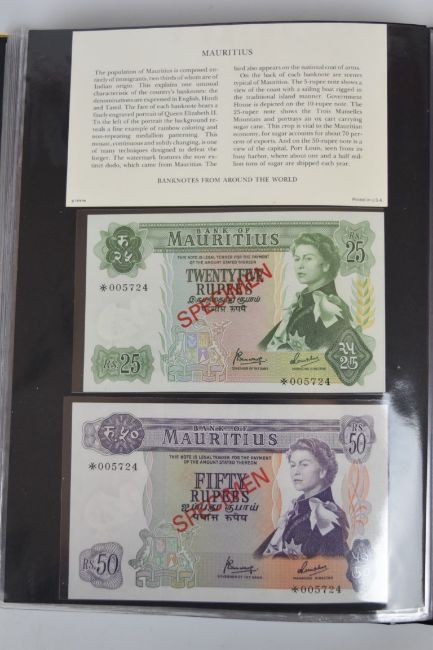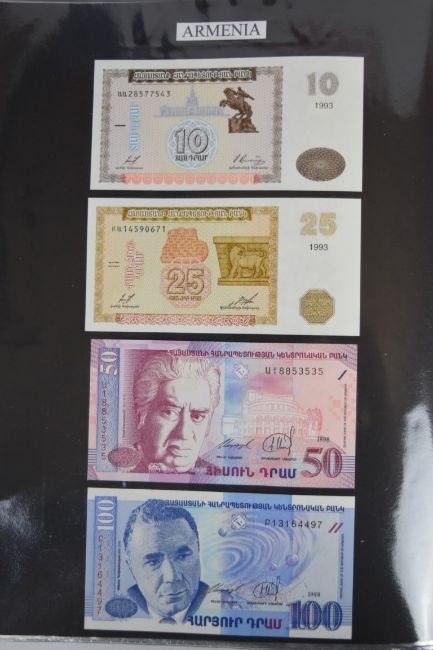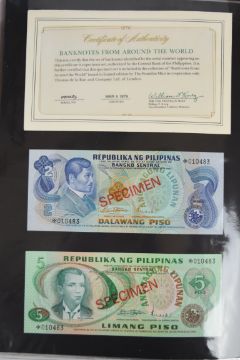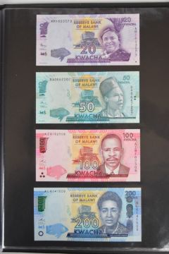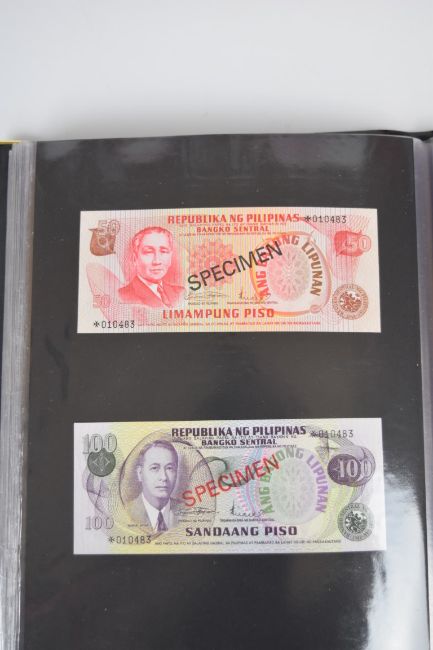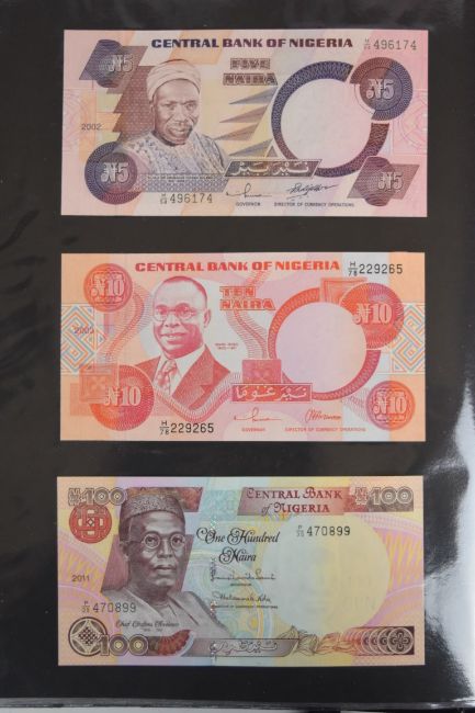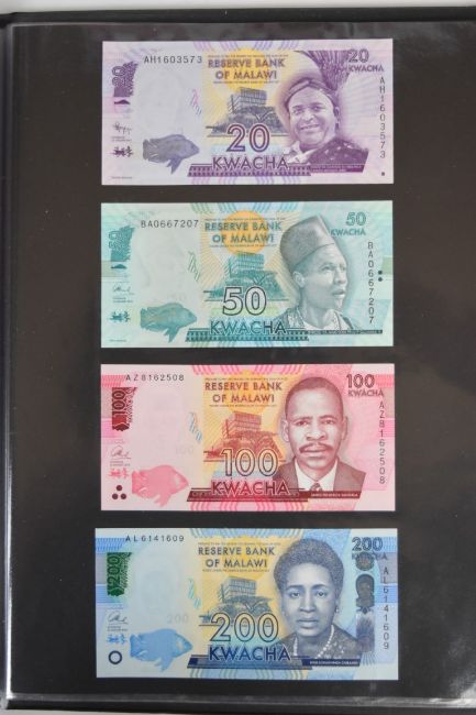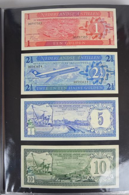 Collection of approximately 240 world banknotes in an album, including Ethiopia, El Salvador, Haiti, Suriname, Burundi, Laos, Nicaragua, Kazakhstan, The Maldives, Moldova, Guatemala, Hong Kong, Ukraine, Bangladesh and others. Some notes are individually encased in plastic wallets, others have been attached directly to thin card with small amounts of weakly adhesive tape