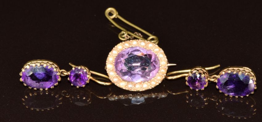 Edwardian yellow metal brooch set with an oval cut amethyst surrounded by seed pearls and a pair of 9ct gold Edwardian earrings each set with a round and oval cut amethyst, 5.4g