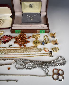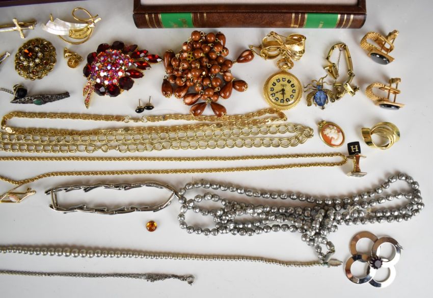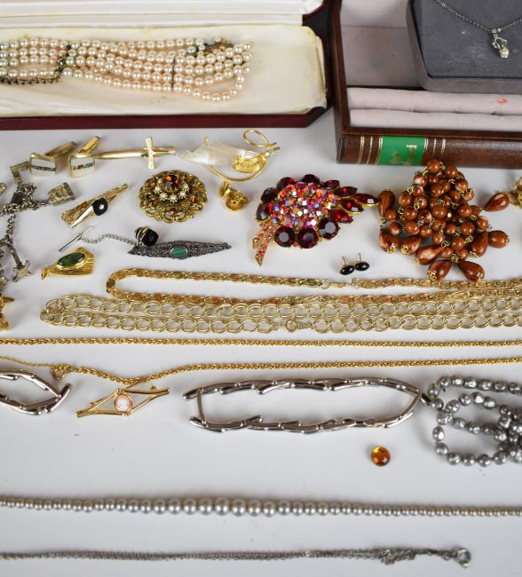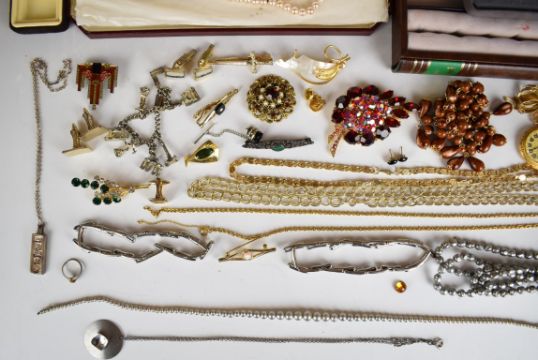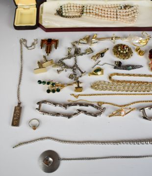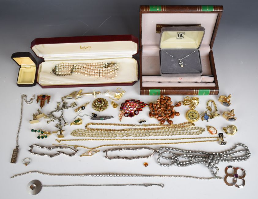 A collection of costume and silver jewellery including vintage brooch, cufflinks, rolled gold pendant, silver ingot pendant, charm bracelet etc.